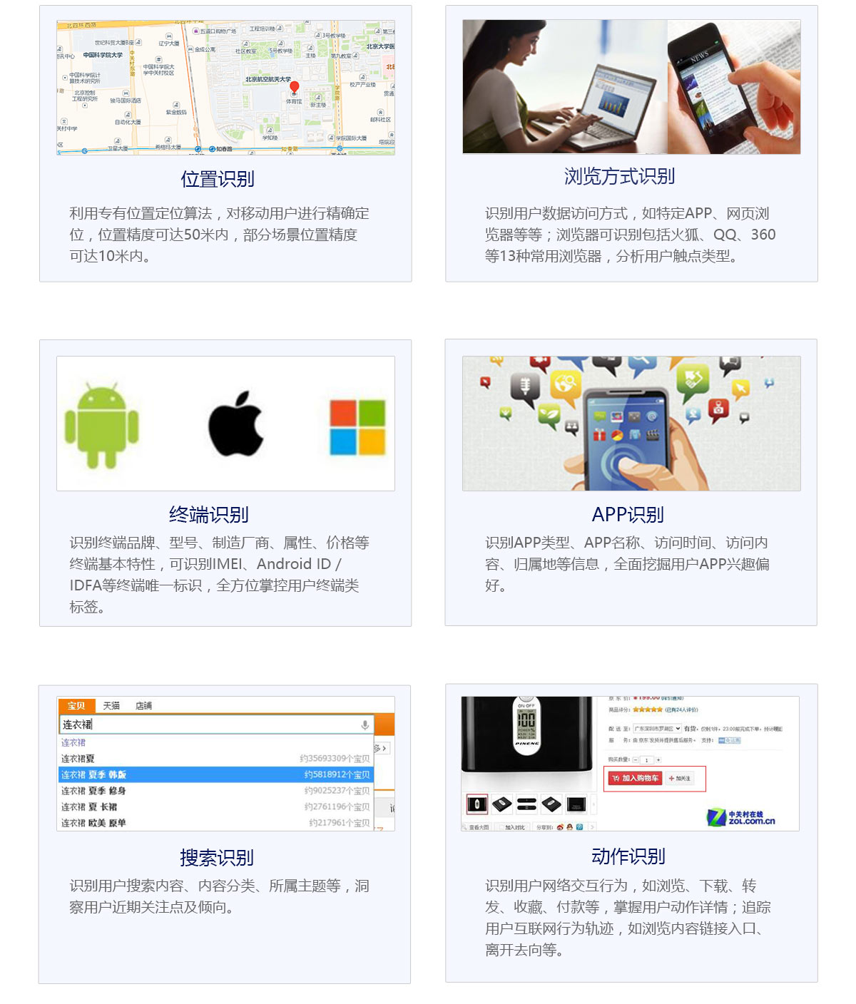 基于Hadoop/Spark架構(gòu)的大數(shù)據(jù)處理平臺,利用數(shù)據(jù)采集平臺收集的相關(guān)數(shù)據(jù),對用戶相關(guān)行為進行分析、聚類、匯總、統(tǒng)計,最終形成用戶位置識別、瀏覽方式識別、終端識別、APP識別、搜索識別、動作識別。
