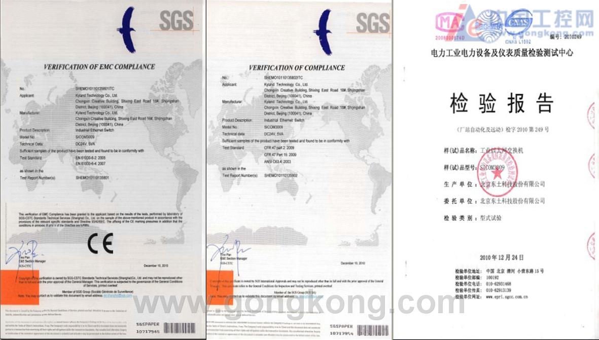 2010年12月23日 Sicom3009卡軌式網管型工業以太網交換機順利取得由SGS公司測試并認證的CE/FCC報告;并在同時間取得電力工業電力設備及儀表質量檢驗測試中心的型式試驗報告。