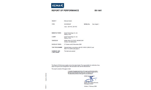 東土自主研發(fā)的SICOM3024P系列工業(yè)以太網(wǎng)交換機(jī)在荷蘭KEMA 公司本部順利通過了基于 IEC 61850和 IEEE 1613標(biāo)準(zhǔn)所進(jìn)行的各項檢測和認(rèn)證。2009年3月27日,東土科技收到了KEMA公司發(fā)來的書面報告,東土成為國內(nèi)首個通過KEMA認(rèn)證的工業(yè)以太網(wǎng)交換機(jī)生產(chǎn)廠家。