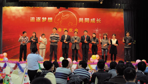 新春聯歡會在熱烈喜慶的音樂中拉開帷幕。首先,主持人帶領大家共同回顧了東土科技在2012年取得的驕人成績;接著,公司發展歷程中的一張張老照片在舒緩的背景音樂中呈現在全體員工的眼前,一幕幕感人的畫面歷歷在目,汩汩暖流涌上心田,正是東土人不畏艱難、不計得失、敢打敢拼的創業精神才推動東土的快速發展。為了表彰和鼓勵在2012年工作中表現優秀的員工,公司董事長、總經理李平先生為2012年度優秀員工頒發了獎杯及獎金,祝賀他們在2012年度取得的優異成績。