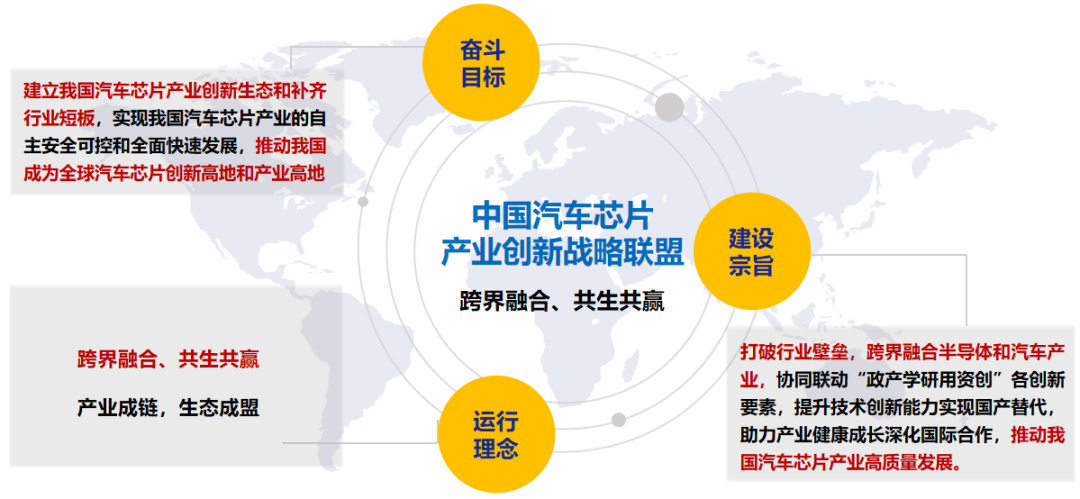 聯盟跨界融合汽車和芯片兩大產業,聯合產業鏈上下游共同組建,主要包括了整車企業、汽車芯片企業、汽車電子供應商、汽車軟件供應商、高校院所、行業組織等共70余家企事業單位。聯盟以“跨界融合、共生共贏、產業成鏈、生態成盟”為運營理念,旨在建立我國汽車芯片產業創新生態,打破行業壁壘,補齊行業短板,實現我國汽車芯片產業的自主安全可控和全面快速發展,推動我國成為全球汽車芯片的創新高地和產業高地。