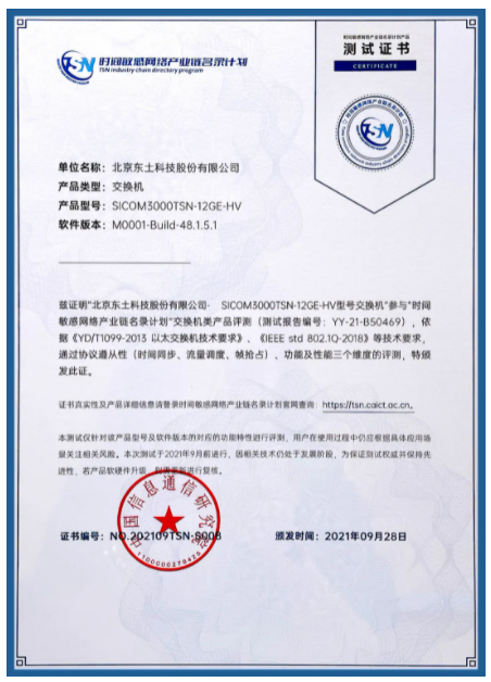 東土科技全系列TSN工業(yè)網(wǎng)絡(luò)產(chǎn)品包含芯片、交換機(jī)、終端、交換軟件平臺(tái)、CNC及邊緣控制器等,其中SICOM3000TSN交換機(jī)于2021年9月28日在工業(yè)和信息化部主辦的“2021工業(yè)互聯(lián)網(wǎng)網(wǎng)絡(luò)創(chuàng)新大會(huì)”上榮獲首批“時(shí)間敏感網(wǎng)絡(luò)(TSN)產(chǎn)業(yè)鏈名錄計(jì)劃”測(cè)試認(rèn)證證書,并已在重慶、西安、沈陽(yáng)等地實(shí)際工廠進(jìn)行應(yīng)用,系統(tǒng)提供了微秒級(jí)確定性服務(wù),保證實(shí)時(shí)性需求;產(chǎn)品可降低整個(gè)通信網(wǎng)絡(luò)復(fù)雜度,實(shí)現(xiàn)周期性數(shù)據(jù)和非周期性數(shù)據(jù)同時(shí)傳輸;有效提升了產(chǎn)線中工業(yè)控制流量傳輸?shù)膶?shí)時(shí)性、確定性和網(wǎng)絡(luò)的穩(wěn)定性。