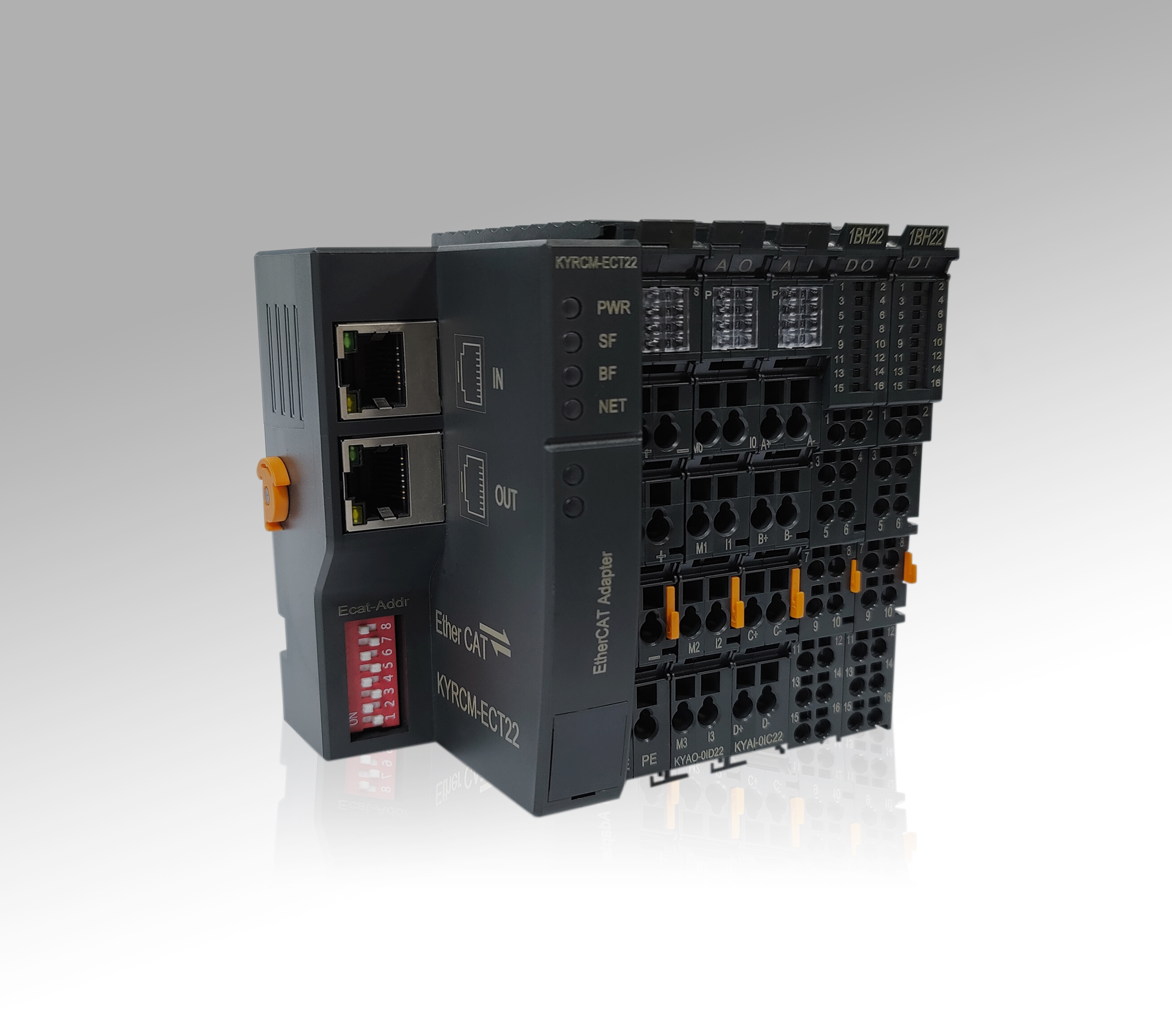 KYIO-M系列產(chǎn)品最大的優(yōu)勢是:具備更豐富的總線模塊,支持ModbusTCP、EtherCAT及Profinet三種通信模塊,其適用性更強、兼容度更高;硬件尺寸更加小巧緊湊,適用于安裝在空間較緊張的場景。