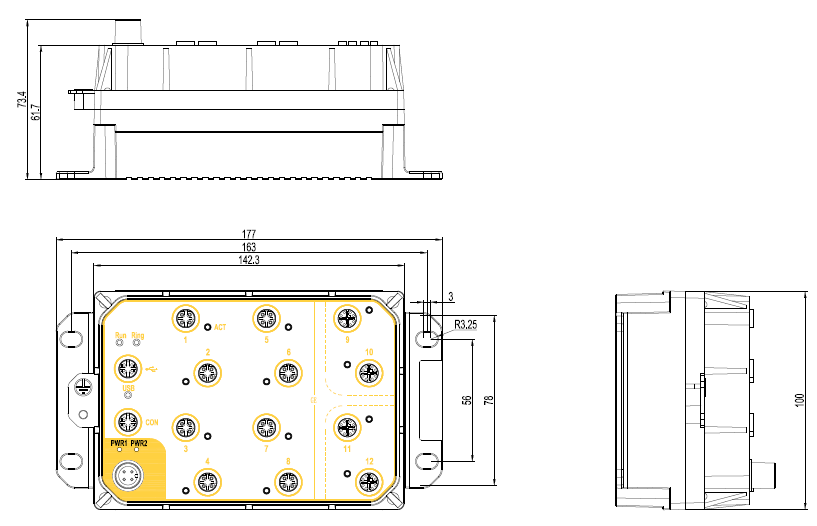 | 機械結構 | 外殼: 金屬 散熱方式: 自然冷卻,無風扇 防護等級: IP65 尺寸: 100mm×177mm×111.7mm(H×W×D)帶散熱肋 100mm×177mm×73.4mm(H×W×D)不帶散熱肋 重量: <2Kg 安裝方式: 壁掛式 |