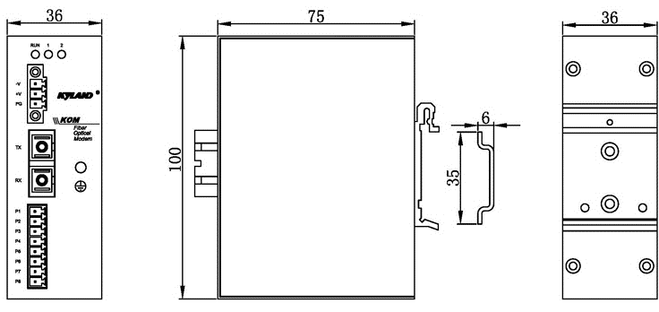 | 機械結構 | 外殼 金屬材質 散熱方式 自然冷卻,無風扇 防護等級 IP30 尺寸 36mm×100mm×75mm(W×H×D) 重量 0.3Kg 安裝方式 DIN卡軌式 |