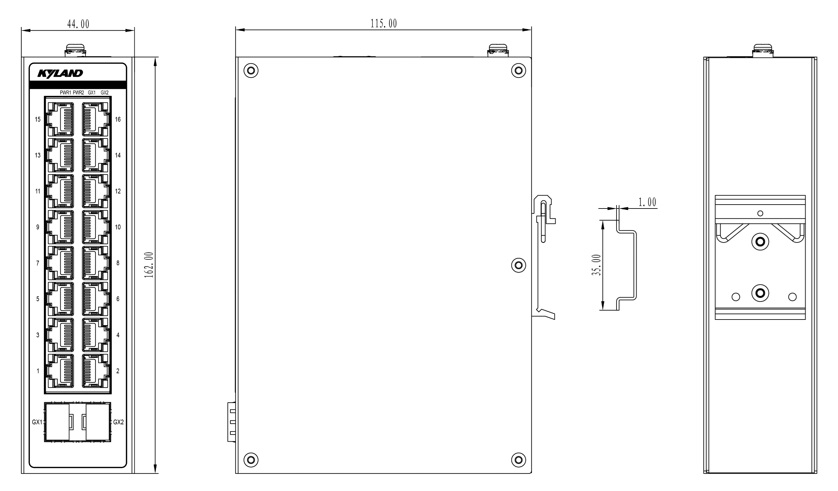 | 機械結構 | 外殼 金屬材質 散熱方式 自然冷卻,無風扇 防護等級 IP40 尺寸 44mm×162mm×115mm (W×H×D) 重量 0.5Kg 安裝方式 DIN卡軌式或壁掛式 |