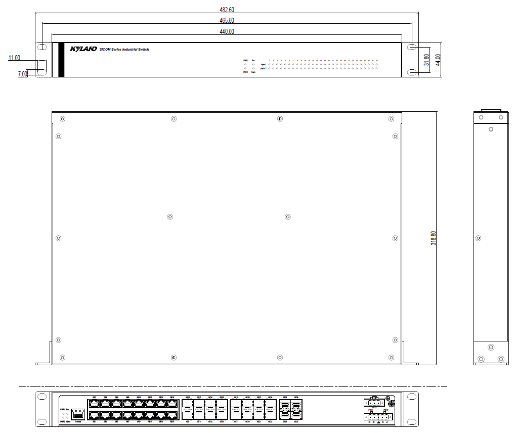 | 機械結構 | 外殼 金屬材質 散熱方式 自然冷卻,無風扇 防護等級 IP40 尺寸 440mm×44mm×318.8mm(W×H×D) 重量 <3Kg 安裝方式 19英寸1U機架式 |